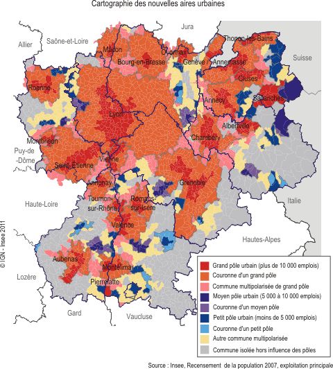 Selon l’INSEE, qui a dévoilé ces chiffres hier, l’aire urbaine prend en compte les communes dont les actifs travaillent au sein de ce que les démographes appellent le pôle urbain. Autour de ce ‘cœur’ de l’aire urbaine, où sont concentrés au moins 10000 emplois, on trouve la couronne de ce pôle, qui est composée des communes où au moins 40% des actifs travaillent dans le pôle, le tout constituant l’aire urbaine. Savigny, Bourgoin ou Ambérieu font ainsi partie de la couronne, et Villefranche, Villeurbanne ou Lyon font désormais partie du même pôle urbain.