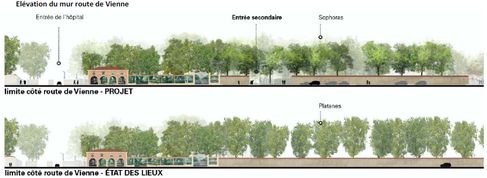 L’équipe a ainsi proposé une recomposition du Clos Layat au travers de quatre thématiques : la mémoire de l’hôpital,  (en faisant déborder le boisement au-delà de la limite), la relation avec les terrains sportifs, la route de Vienne en marquant ponctuellement l’entrée du parc sans rompre le périmètre du mur, et l’osmose de la biodiversité et des usages.