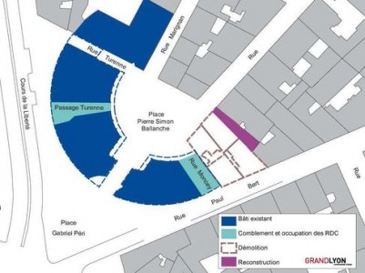 Le Grand Lyon a adopté une délibération visant à la démolition des immeubles situés au 9-11 rue Paul Bert, et au 10-12 rue Moncey, dans le cadre de la requalification de la place Pierre Simon Ballanche.