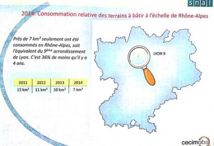 7 km2 de terrains à bâtir ont été consommés en Rhône-Alpes en 2014 pour construire des maisons, selon les chiffres de l’Observatoire 2015 du SNAL Rhône-Alpes Bourgogne Franche-Comté publié il y a quelques semaines. Un chiffre en diminution de 36% par rapport à celui enregistré il y a 4 ans. Par département, on note que c’est en Isère que la consommation relative d’espace en Rhône-Alpes est la plus forte, avec 148 hectares, devant la Haute-Savoie (97), l’Ain (96), la Loire (88), l’Ardèche (85), le Rhône (80), la Drôme (78) la Savoie (67), et la Métropole de Lyon (28). Seulement 1.1 m² est consommé par an par habitant pour la construction de maison, tandis que 2 m² étaient consommés en 2011, selon les chiffres de l’Observatoire établi sur la base des chiffres du CECIM et de Perval.