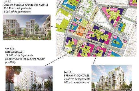Clément Vergely Architectes / et SIZ’-IX a ainsi remporté le lot 11, qui comprend 10 250 m² de logements, et 1 080 m² de commerces. Nicolas Mallet a quant à lui été désigné lauréat du lot 12b, qui comprend 11 665 m² de logements (Le lot 12a sera quant à lui réalisé par TVK). Le Lot 13 a, quant à lui, été remporté par Syur Brenac & Gonzalez. Il comprend 7 150 m² de logements et 800 m² de commerces.
