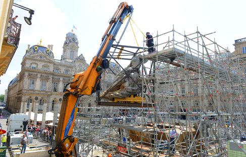 Le démontage de la statue Bartholdi, dans le premier arrondissement de Lyon, s'est concrétisée jeudi, avec le détachement de la sculpture de son socle.