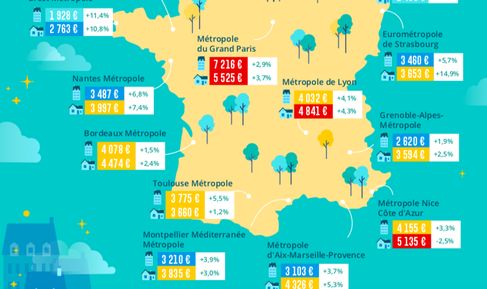 En région, on assiste à une progression des prix sur trois mois dans une majeure partie des grandes villes de France, à l’image de Marseille (+2% à 3.235€ le m²), de Toulouse (+2,9 % à 3.580€ le m²), ou encore Nantes (+3,7% à 3.725€ le m²). Mais certaines villes voient inversement leurs prix baisser : c’est le cas de Bordeaux (-4% à 4.680€ le m²), de Rennes (-4% à 3.479€ le m²), ou encore de Lille (-2,3% à 3.322€ le m²).