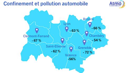 En région Auvergne-Rhône-Alpes la diminution des concentrations d’oxydes d’azote est sensible, comme on peut le constater dans l’étude nationale qui agrège les observations réalisées dans les différentes régions. La baisse constatée oscille, dans la région, de -54% à -72% en fonction du territoire. On notera que les plus fortes baisses sont constatées dans les villes de Grenoble, Clermont-Ferrand et Annecy. Le recul est de 63 % à Lyon, et de 65 % dans l'agglomération lyonnaise.