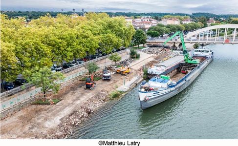 La Métropole de Lyon utilise, dans le cadre de l’aménagement et de la renaturation des quais de Neuville-sur-Saône, au maximum le transport fluvial pour la logistique du chantier. Ceci permet de limiter fortement le recours aux camions et de réduire l’empreinte carbone du chantier.